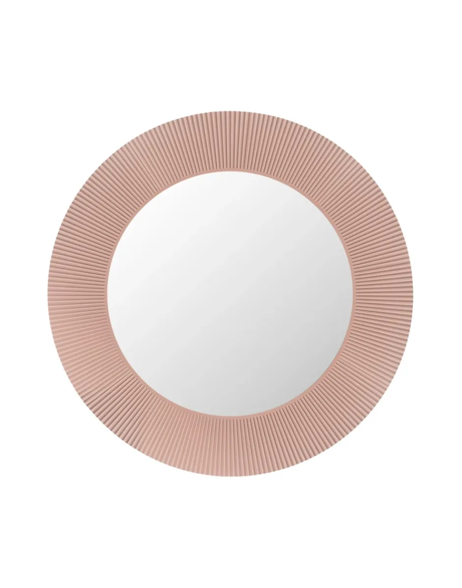 Specchio rotondo con una cornice trasparente o colorata, dal particolare effetto plissettato.