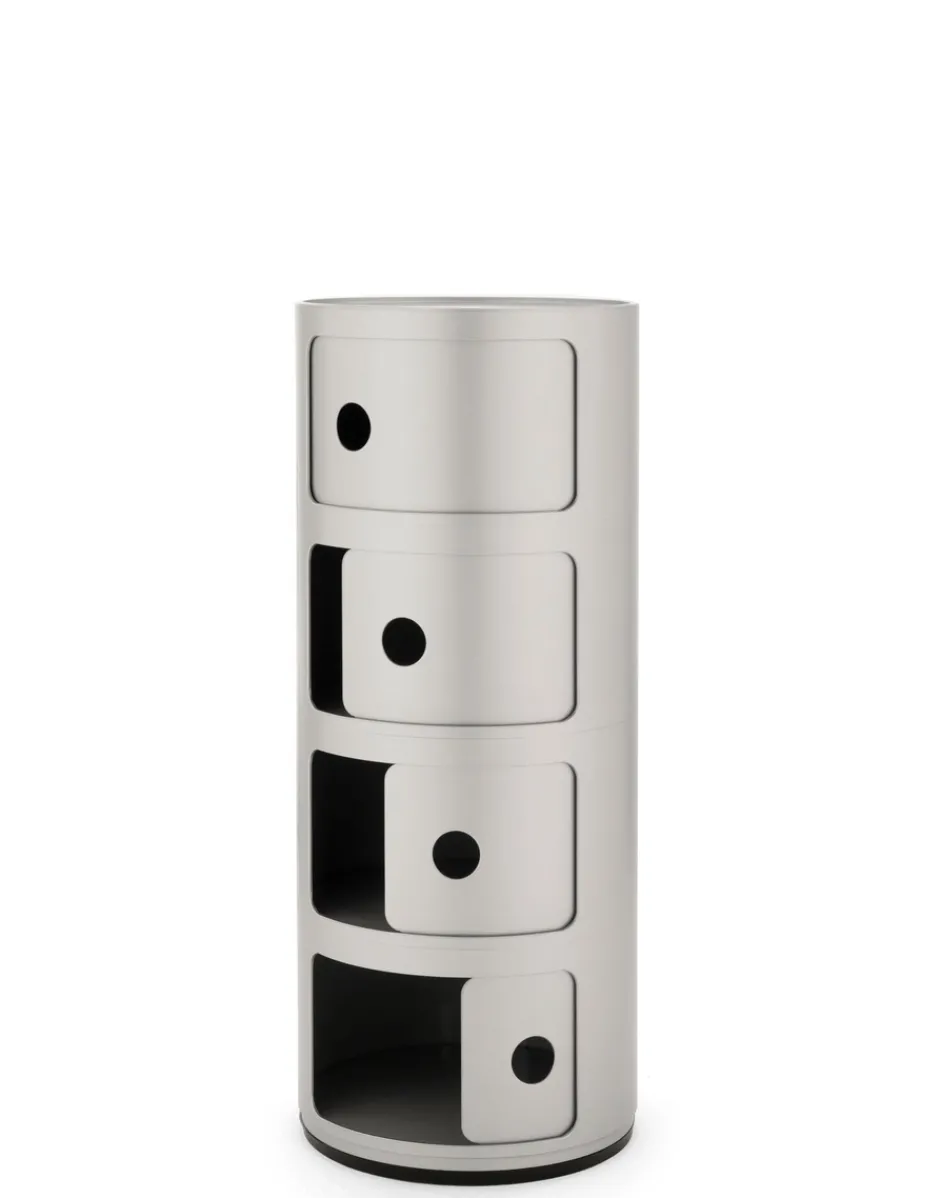 Gli elementi componibili sono stati progettati per rispondere a diverse esigenze d’uso e vivere in ogni ambiente della casa. I Componibili nati nel 1967 sono un classico senza tempo dell’arredamento, sono proposti oggi in forma rotonda con diametro da 32 cm. Grazie alle composizioni fisse da due, tre e quattro elementi risultano essere funzionali e pratici per ogni ambiente. Questo modello viene proposto in sei finiture glossy e una finitura silver opaca.