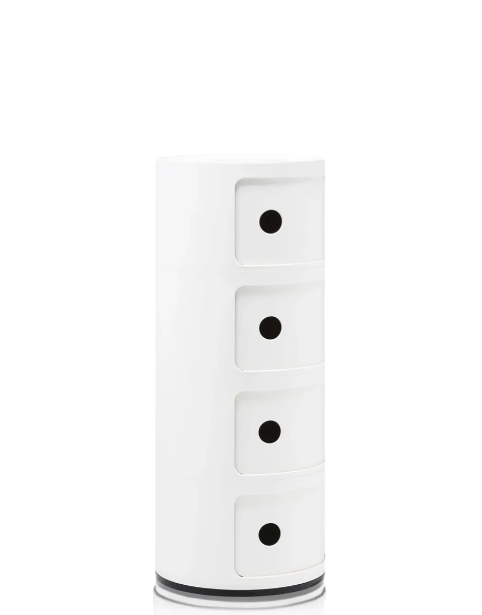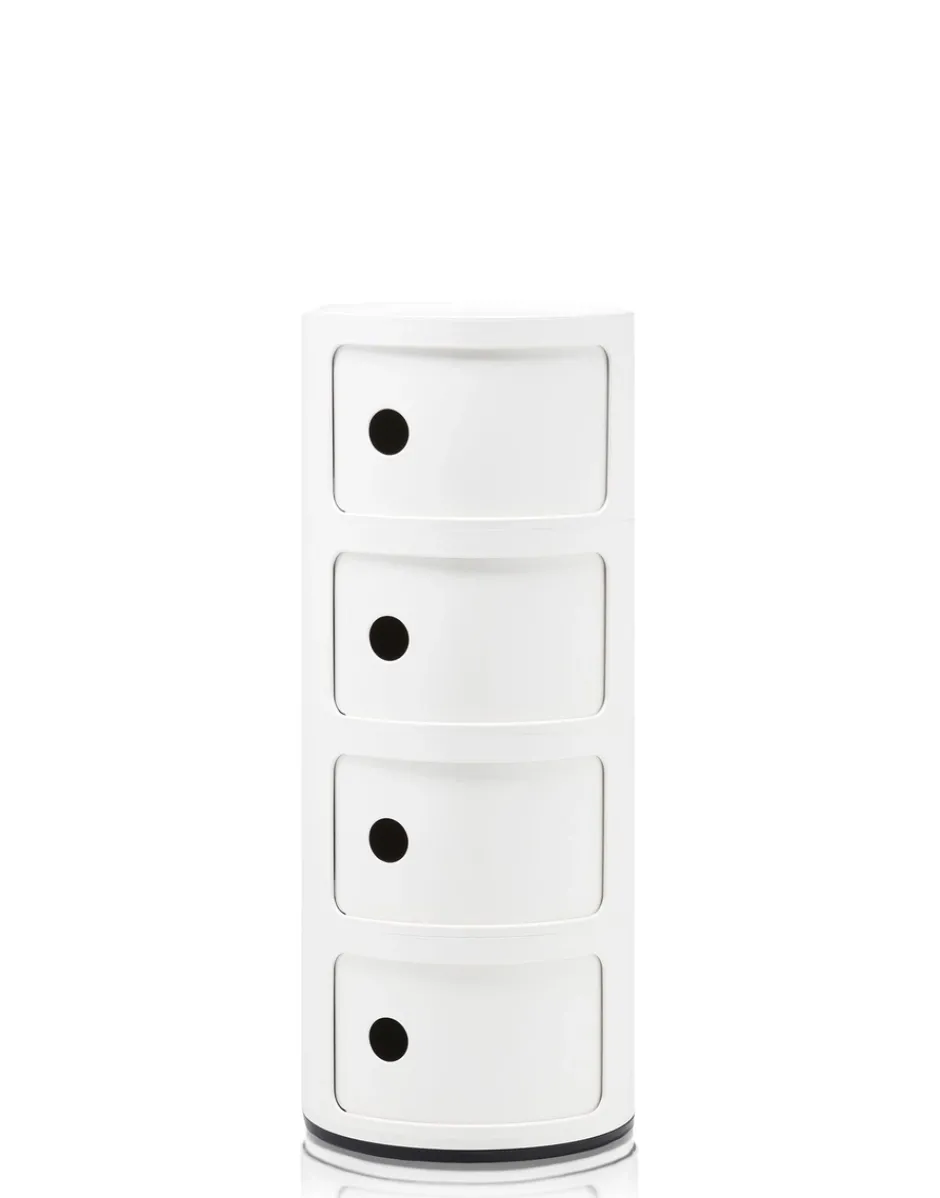 Gli elementi componibili sono stati progettati per rispondere a diverse esigenze d’uso e vivere in ogni ambiente della casa. I Componibili nati nel 1967 sono un classico senza tempo dell’arredamento, sono proposti oggi in forma rotonda con diametro da 32 cm. Grazie alle composizioni fisse da due, tre e quattro elementi risultano essere funzionali e pratici per ogni ambiente. Questo modello viene proposto in sei finiture glossy e una finitura silver opaca.
