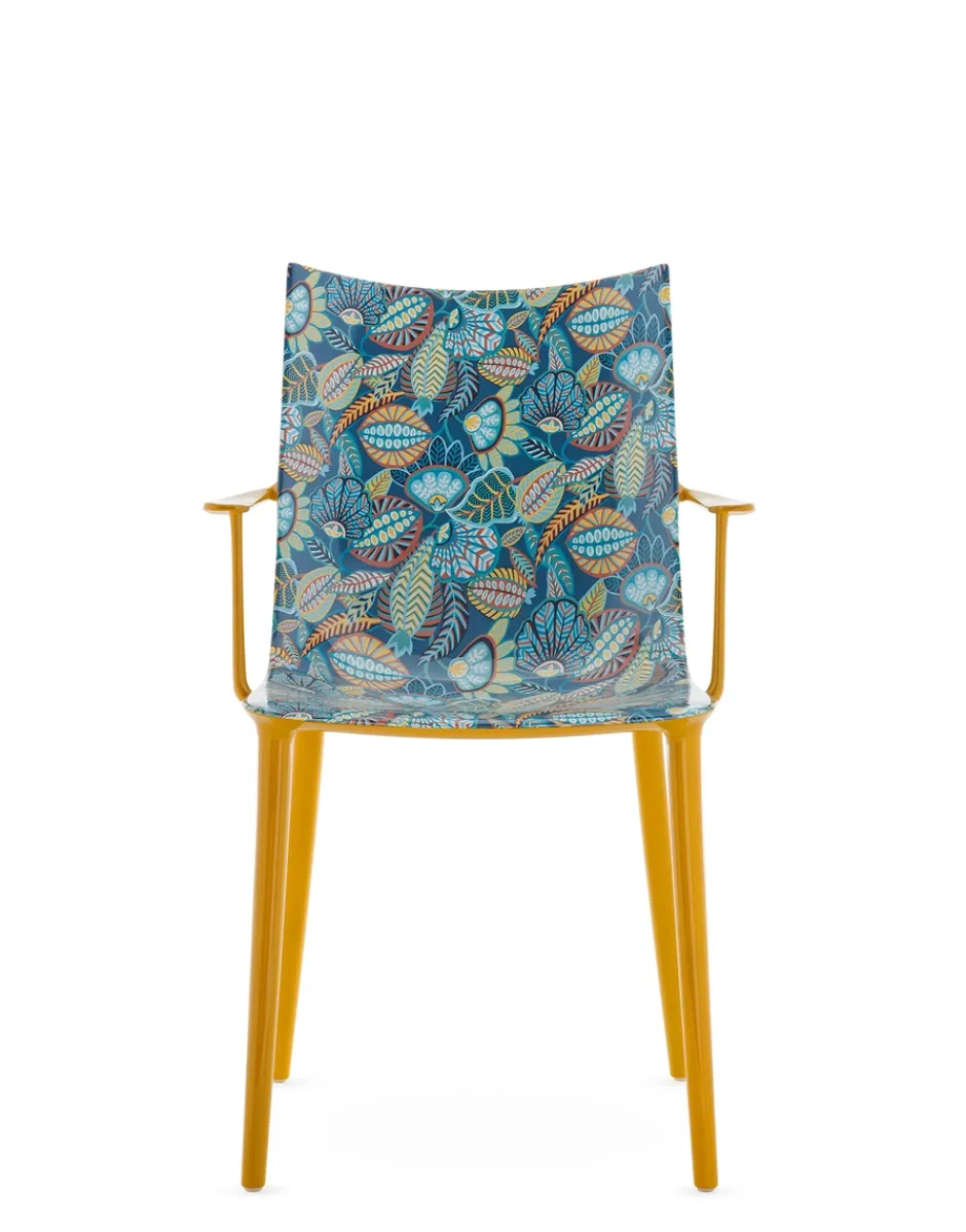 Philippe Starck ci conduce verso un nuovo vertice con la sedia H.H.H. – HER HIGHEST HIGHNESS. Con un’eleganza e un’imponenza grafica senza pari, H.H.H. definisce l’essenza stessa dell’essere umano che interagisce con essa, costringendolo a prendere una posizione. Un oggetto che va oltre il mero concetto di seduta, trasformando ogni momento trascorso su di essa in un momento di vera e propria regalità. La struttura è in materiale riciclato e la seduta è disponibile in diverse finiture: pelle riciclata con trattamento di concia green, nei colori nero e cuoio, ecofriendly texture proveniente in parte da materiale riciclato e in parte da fonti rinnovabili nei colori nero e tabacco e nella finitura lucida super glossy nei colori bianco, nero, bordeaux, ruggine, senape, blu e verde.Ma H.H.H. si eleva al di sopra delle semplici funzioni pratiche di una sedia, diventando un emblema di stile e che incanta e ispira chiunque vi si avvicini grazie all’edizione Kartell x Liberty, rivestita in sei tessuti Liberty con vivaci stampe floreali.Fedele al suo essere pioniera nella ricerca di nuove e diverse forme di innovazione tecnologica, Kartell ha inoltre deciso di fare un ulteriore passo in questa direzione, sperimentando una nuova tecnica di “graphic impression” in cui, con uno stampaggio altamente tecnologico, vengono proposti 4 pattern floreali e geometrici in diverse versioni cromatiche.