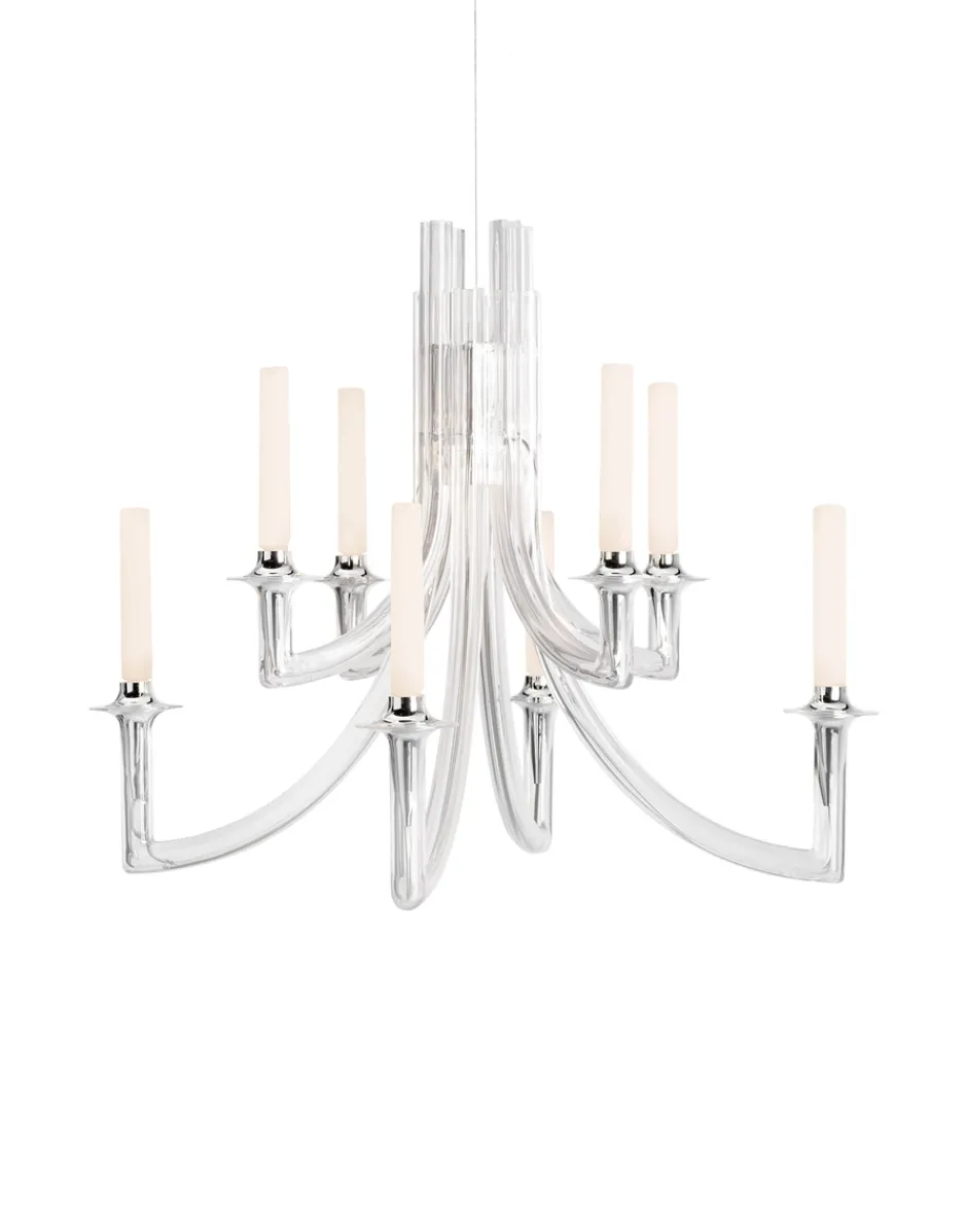 Lo chandelier KHAN di Philippe Starck l’incontro di stili, dall’eclettismo settecentesco al minimalismo contemporaneo, crea un nuovo stilema di eleganza e modernità. Il segno del design incontra l’innovazione tecnologica del nuovo policarbonato 2.0. nei colori nero, champagne e trasparente