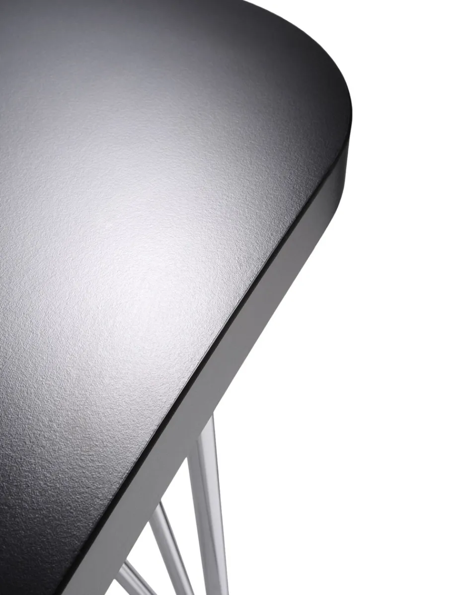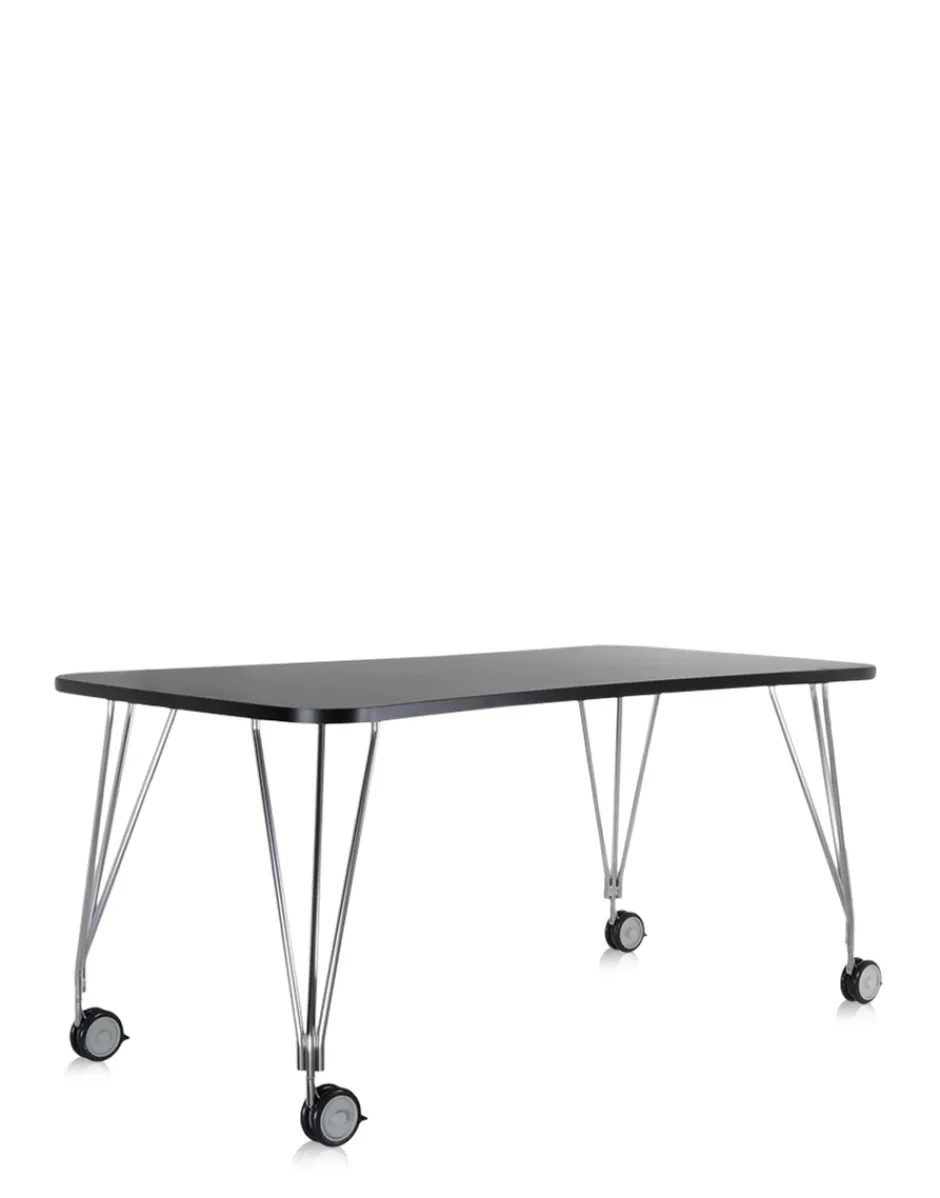 Un tavolo scrivania nato per l’ufficio. La morbida forma simile ad una clessidra consente di comporre un insieme fra più tavoli dello stesso tipo e di unire alla composizione anche altri elementi. Può vivere da solo come singola postazione di lavoro o insieme ai suoi simili per creare delle isole se inserito in open space. Le gambe sono composte da tre tubolari metallici che si riuniscono alla base terminando su ruote o su piedi. Le ruote sono anche dotate di freno autobloccante per assicurare la stabilità.