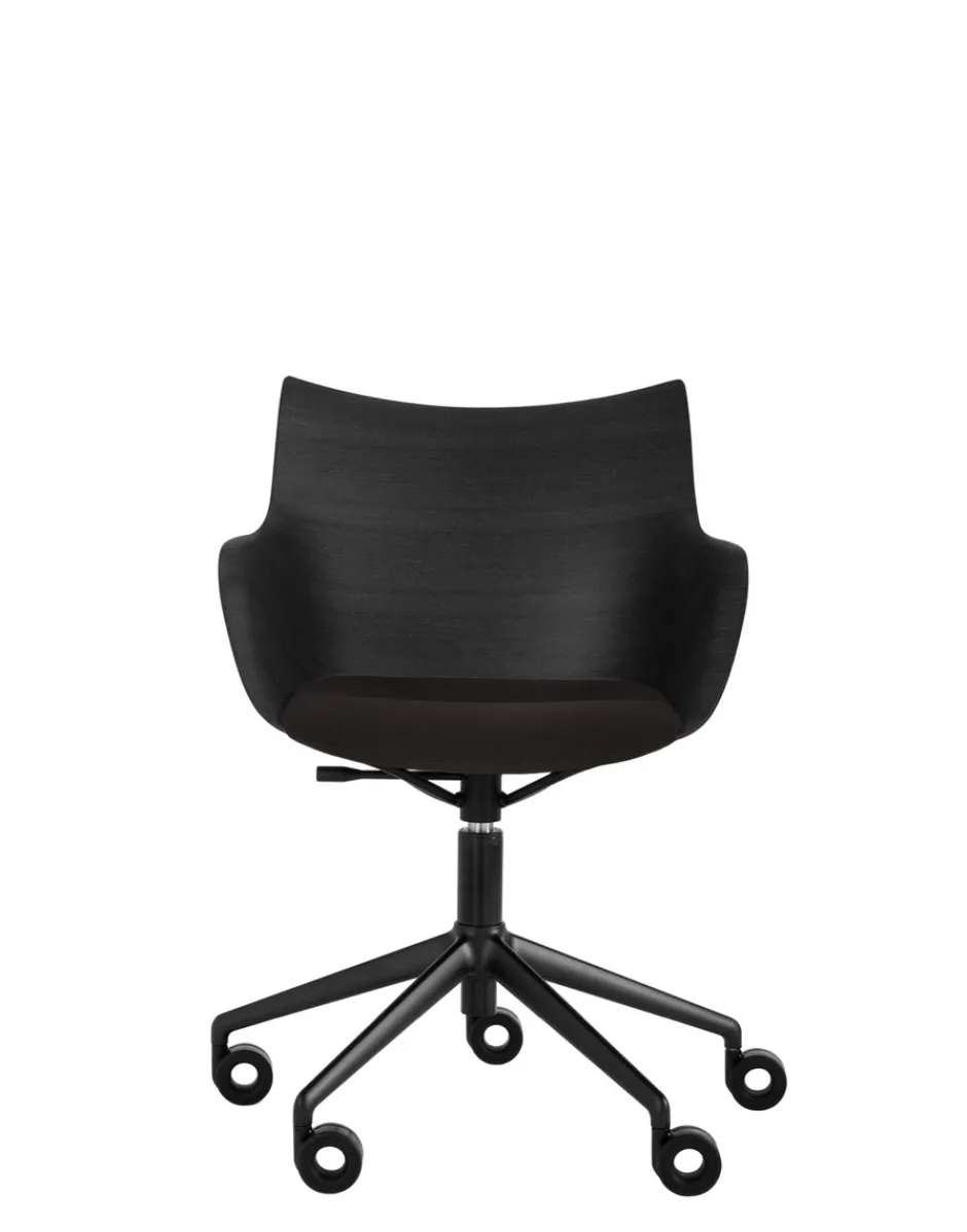 La famiglia di poltroncine si arricchisce della nuova versione girevole a rotelle. Q/wood è caratterizzata da una lavorazione unica del legno che unisce un’eleganza senza tempo a forme contemporanee ed è disponibile in tre varianti di colore: legno chiaro con seduta bianca e struttura cromo; legno scuro con seduta nera e struttura cromo e in legno scuro nero con struttura nera.