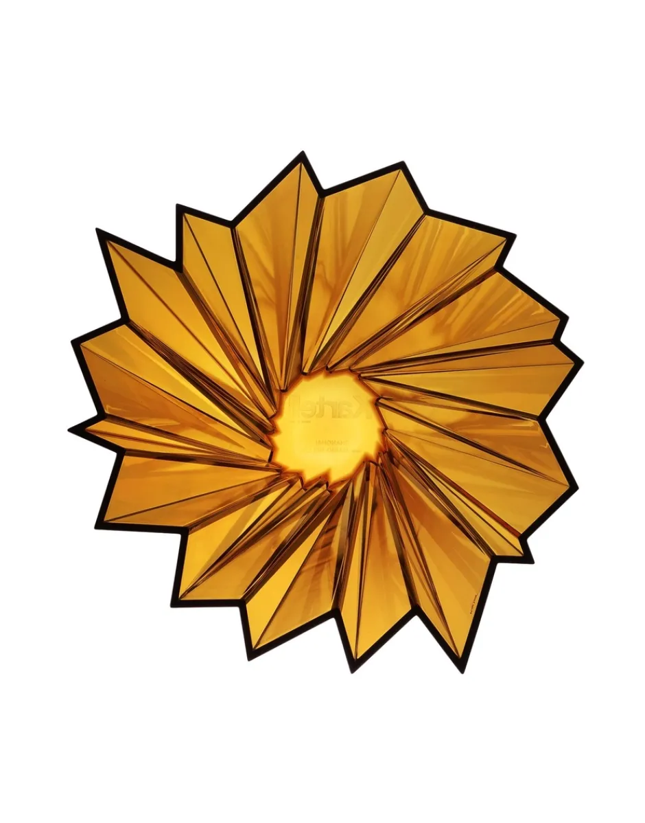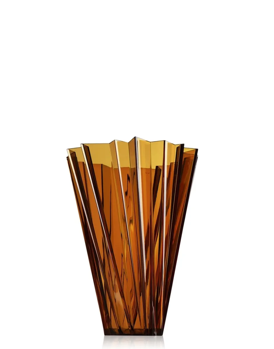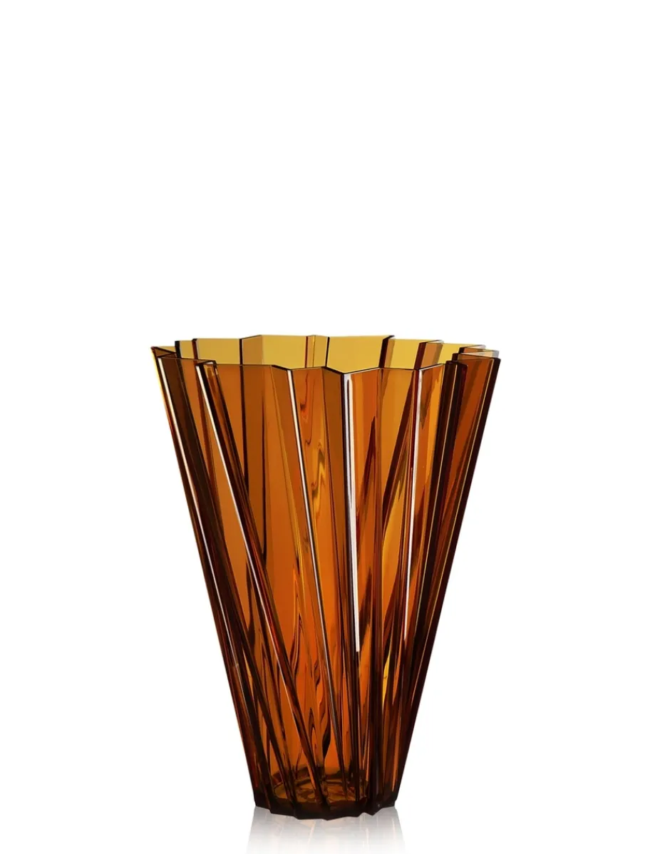 Un vaso sfaccettato, che si apre dalla base alla sommità come spinto da un movimento vorticoso dando vita a forme geometriche irregolari.